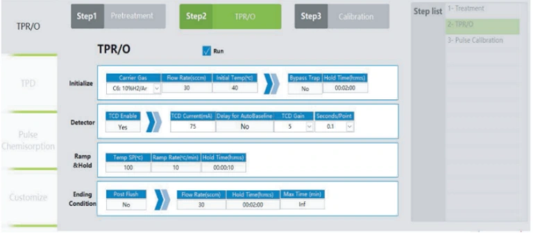 The AMI-400TPx features a user-friendly interface and intuitive layout that simplifies experimental design. Users need only to input the changeable process variables, while the system automatically handles the rest—making setup quick and error-free. Flexible selection or customization of methods such as TPD, TPO, TPR, TPSR, and pulse calibration is supported, with the ability to configure up to 99 fully automated programs. A complete experiment can be set up in just a few minutes, streamlining workflows and boosting lab productivity.