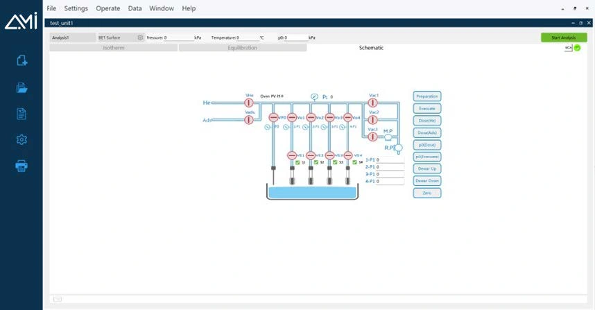 Each analysis station features dedicated dosing and evacuation control for independent test execution. The system supports both pressure-based and volumebased dosing, with user-selectable options for quantitative or constant-pressure dosing. Smart sequencing ensures efficient dosing across multiple stations while avoiding gas cross-talk so that each station can run a different test (i.e. BET, isotherm), but with the same adsorbate.