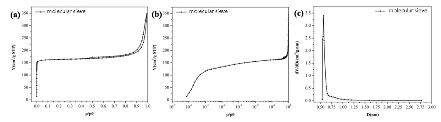 Zeolite catalysts are a class of microporous crystalline materials with uniform pore structures and extremely high surface areas. Figure 1 demonstrates nitrogen adsorption-desorption curves. In the low-pressure region, nitrogen adsorption sharply increases due to micropore filling. The HK pore size distribution reveals the most probable diameter is 0.57 nm, and the BET surface area is calculated as 675 m²/g.