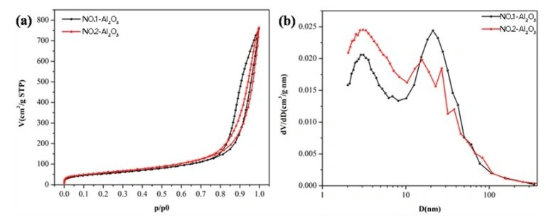 ctivated alumina is another widely used catalyst support. It shows excellent surface acidity and thermal stability. Figure 2 shows adsorption curves of two alumina samples with surface areas of 192.32 m²/g and 210.81 m²/g. BJH analysis indicates pore size peaks at 3 nm and 21 nm.