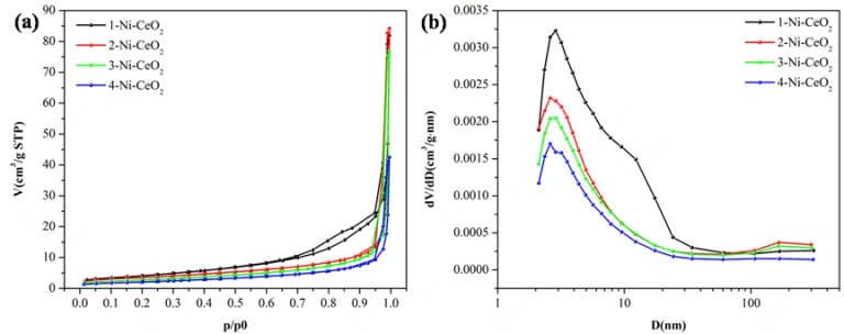 FIGURE 3: (a) Ni@CeO₂ N₂ Adsorption-Desorption Isotherms, (b) BJH Pore Size Distribution