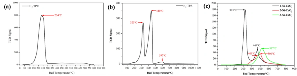 FIGURE 4: H₂-TPR (a) Alumina-supported Catalyst, (b) Mn₂O₃-based Catalyst, (c) Ni@CeO₂ Catalyst Temperature-Programmed Oxidation (TPO)