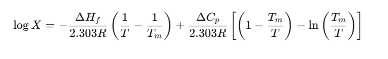 The following well-known thermodynamic equation relates solubility (X) to heat of fusion (ΔHf), melting point (Tm), and heat capacity change (ΔCp) [1]: