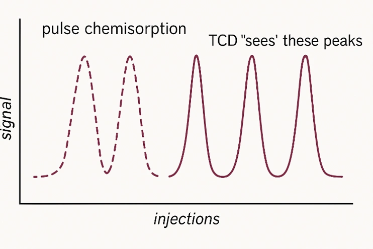 During the experiment, a fixed volume of reactive gas is repeatedly pulsed into a flowing carrier gas stream through a calibrated sample loop. As the gas passes over the catalyst bed, it interacts with exposed metal sites, while unadsorbed gas is carried to a thermal conductivity detector (TCD), generating a series of pulse peaks (Figure 3).