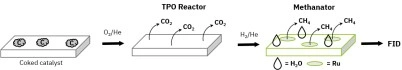 Temperature-programmed oxidation (TPO) is a materials characterization technique in which the sample is exposed to oxidizing gas, and the oxidizer chemically binds (chemisorbs) onto the surface. As the material temperature is increased, the oxidized surface species desorb from the material and are analyzed by a detector. For coke analysis, the catalyst is heated under O₂ flow, and surface carbon is oxidized to CO₂. The amount of desorbed CO₂ is directly related to the amount of coke, and the temperature at which CO₂ desorbed can differentiate between types of carbon on the catalyst. Typically, the desorbed product is analyzed by a thermal conductivity detector (TCD) or flame ionization detector (FID), but neither detector is sufficiently sensitive to CO₂. Therefore, a methanation step can be employed to convert CO₂ into CH₄, which is easily measured by a flame ionization detector (FID). This process is shown in Scheme 1.