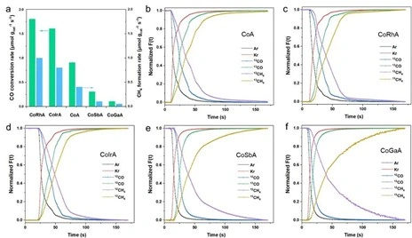 Figure 2: (a) CO conversion rate and CH4 formation rate on CoM/Al2O3 catalyst under SSITKA condition. Normalized transient curves of (b) CoA, (c) CoRhA, (d) CoIrA, (e) CoSbA, and (f) CoGaA.