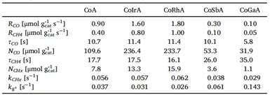 Through steady-state SSITKA parameter analysis, it is found that: The amount of NCO surface intermediates of the reactants of CoRh/Al2O3 and CoIr/Al2O3 was (236 and 234 μmol gcat-1), respectively, which was 2 times higher than that of CoA (109.6 μmol gcat-1). The reduction of CoSb/Al2O3 and CoGa/Al2O3 catalysts is 53 and 39 μmol gcat-1, respectively. These data indicate that the precious metals Ir and Rh can promote the catalyst and increase more active sites, so that more CO can be adsorbed. The quantity of intermediates on the surface of the product NCHx has the same trend. However, non-precious metal Sb and Ga auxiliaries showed the opposite trend. At the same time, the residence time of the four auxiliaries was analyzed, and it was found that the residence time of the four auxiliaries had little difference, and the precious metal had no obvious effect on the intrinsic activity of the catalyst, while the non-precious metal reduced the active site and the intrinsic active site.