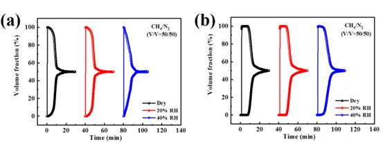 At 20% RH, both materials performed similarly to dry conditions. However, at 40% RH, DMOF failed to recover high-purity methane, while DMOF-TM exhibited earlier breakthrough and reduced selectivity. The decline is attributed to water’s competitive adsorption, which disrupts methane/nitrogen separation【1】.