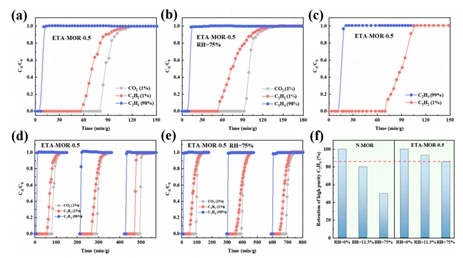 Figure 3: Permeation Curves for ETA-MOR Zeolite Molecular Sieve at 298 K (flow rate 5 ml/min); (a,b) Permeation Curves for ETA-MOR Zeolite in CO2/C2H2/C2H4 (1/1/98, v/v/v) Atmosphere under Dry and 75% RH Conditions; (c) Permeation Curve for ETA-MOR Zeolite in C2H2/C2H4 (1/1/99, v/v/v) Atmosphere; (d, e) Cycle Stability of ETA-MOR Zeolite in CO2/C2H4/C2H4 (1/1/98, v/v/v) Atmosphere under Dry and 75% RH Conditions; (f) Permeation Curves for Modified and Unmodified ETA-MOR at Different Humidities.